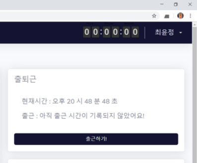 - DB에 출근 data가 존재하지 않을 시 출근 버튼만이 보이며, DB에 출근 시간을 업로드 후 이 버튼을 클릭시 시계 동작을(시각적으로) 시작한다.