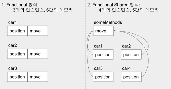 이전의 Functonal방식은 인스턴스를 생성할 때 마다 모든 메소드를 someInstance에게 할당하므로, 각각의 인스턴스들이 메소드의 수만큼 더 차지한다.